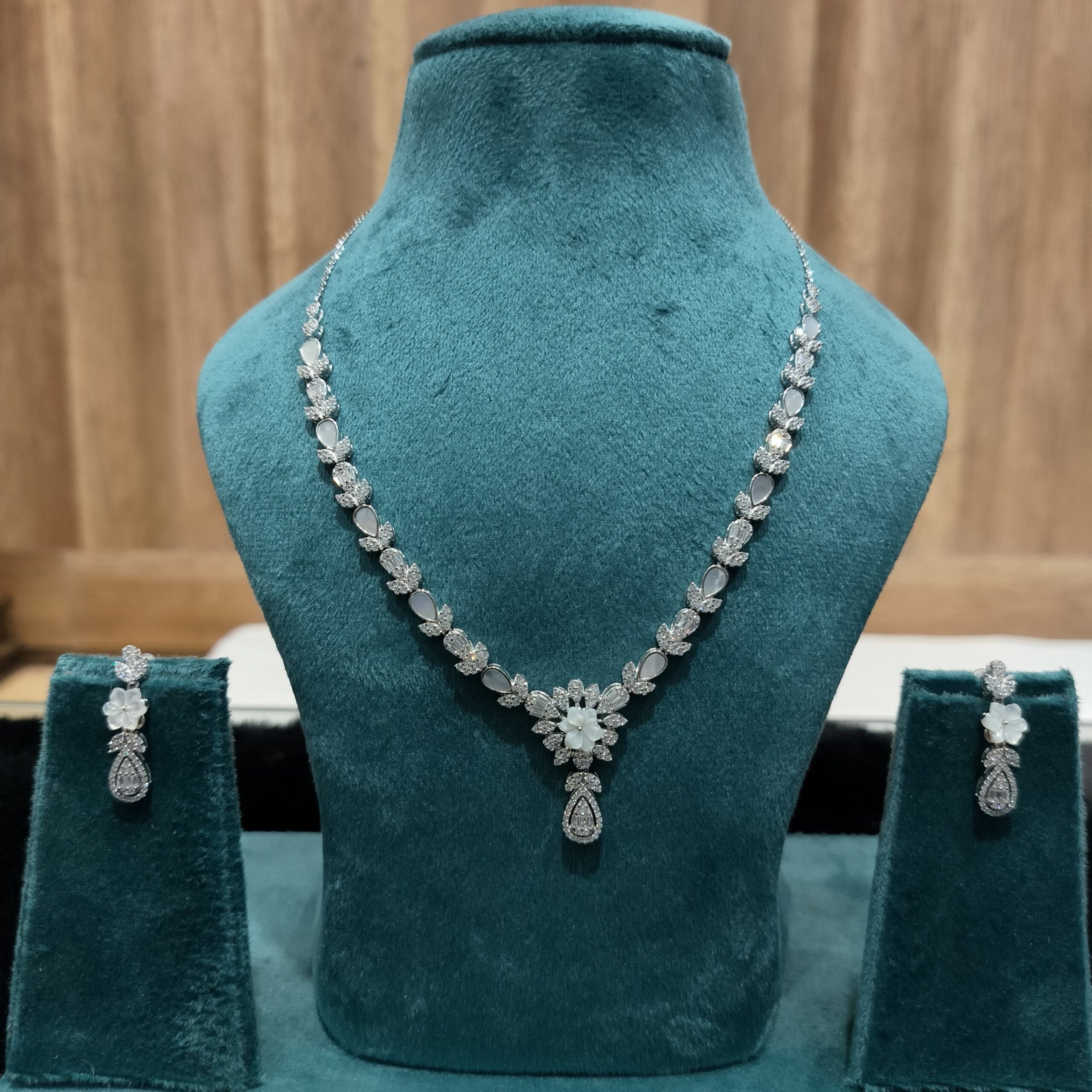 Designed to bring a soft, bridal glow, this floral necklace set pairs petal motifs with a luminous pear?drop center.